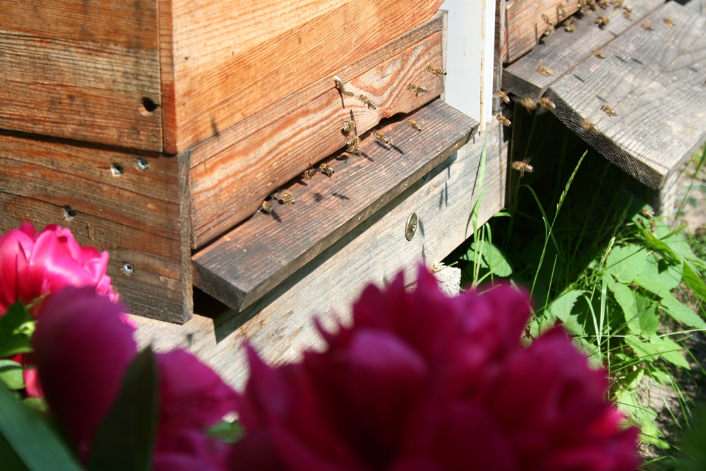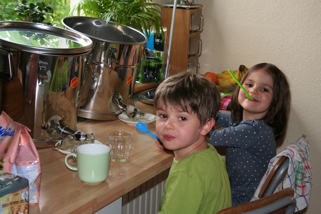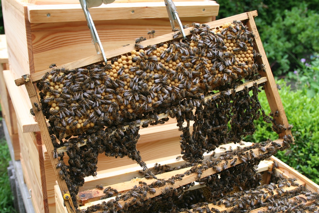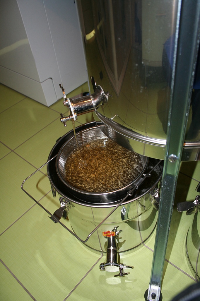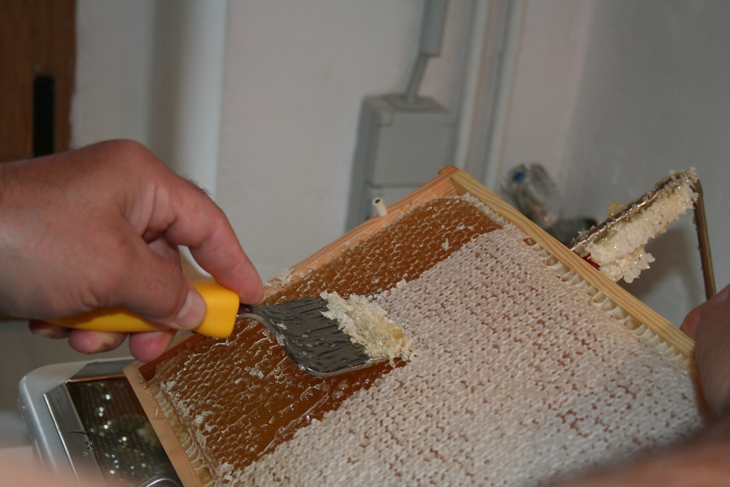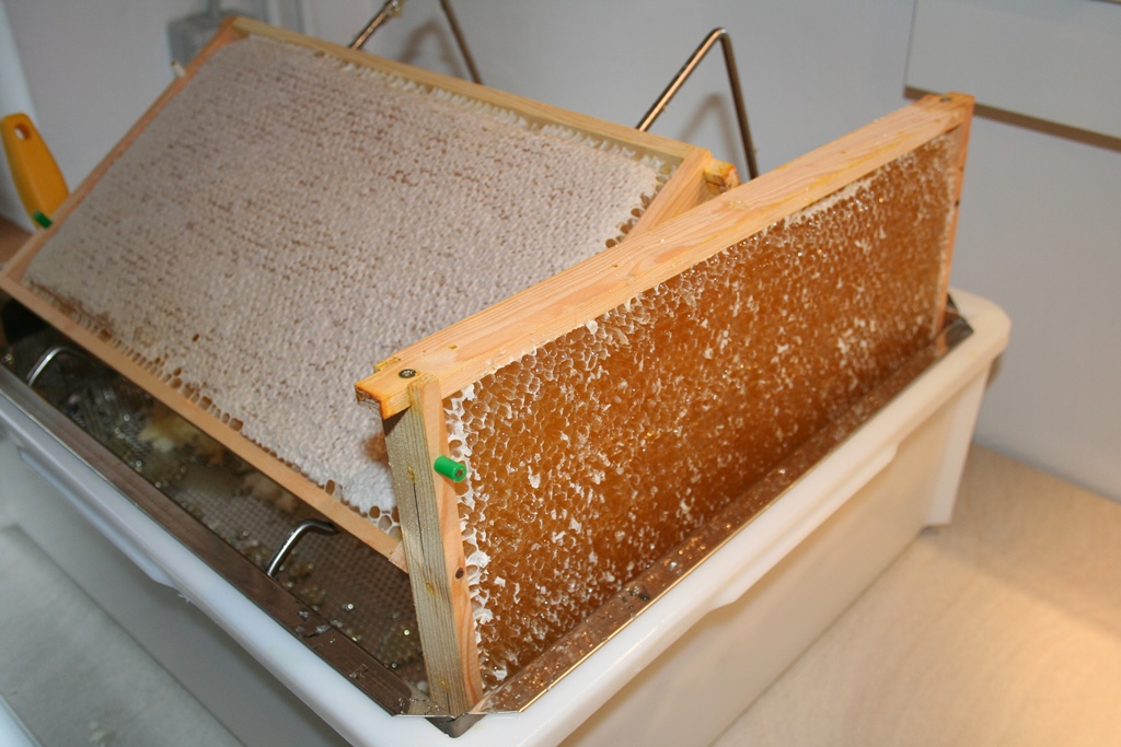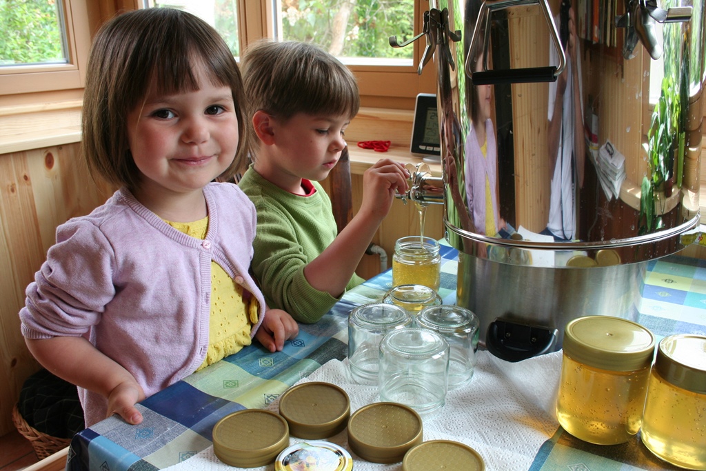 Der Honig wird aus den Rähmchen geschleudert, gesiebt und in Abfülleimern aufgefangen
